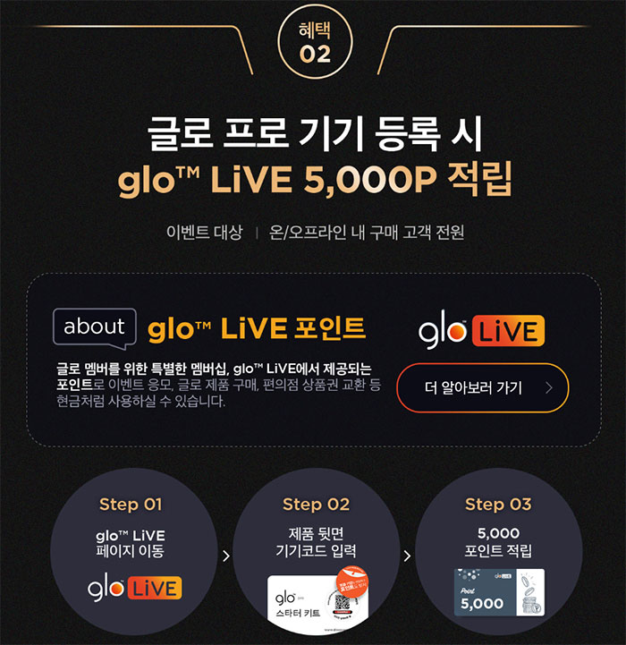 글로 라이브 포인트는 글로 멤버를 위한 특별한 멤버십 포인트로 이벤트 응모, 글로 제품 구매, 편의점 상품권 교환 등 현금처럼 사용할 수 있어 열심히 하게 되는데요. 라이브 포인트로 5%를 적립할 수 있습니다.