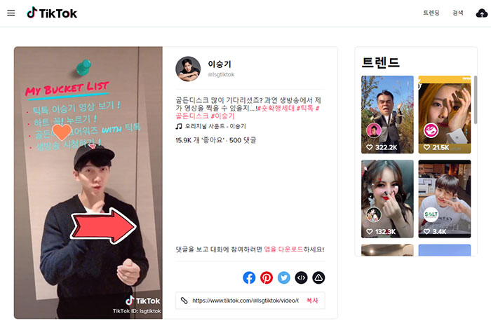 틱톡(TikTok) 앱을 켜 검색하거나 글 말미 링크해 드리는 url을 통해 이승기 사전 영상을 보고 하트를 누르는 방법이 있습니다. 이승기도 해당 영상에서 방법을 설명합니다.