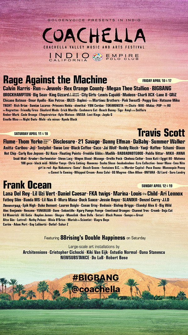 YG엔터테인먼트는 3일 공식 보도자료를 통해 “빅뱅이 4월 10일부터 19일까지 미국 캘리포니아주 인디오에서 열리는 ‘코첼라 밸리 뮤직&아츠 페스티벌(Coachella Vally Music&Arts Festival)’에 초청받았다”라고 밝혔다. 또 4월 10일과 17일 두 차례에 걸쳐 무대에 설 예정이라는 소식까지.