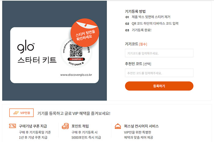 글로 라이브 페이지로 이동해 기존 글로 시리즈 박스에 있는 스티커를 제거하고 나온 기기코드를 입력해주면 5천 포인트를 적립할 수 있습니다.