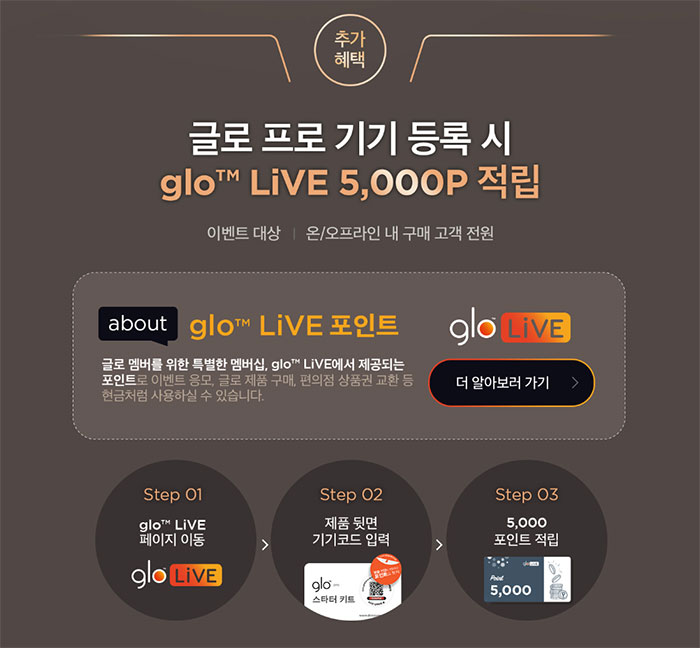 이어 글로 라이브 포인트를 통해 나머지를 만족시켜야 하는데. 글로 라이브 포인트는 글로 멤버를 위한 멤버십 프로그램으로 이벤트에 응모하기도 하고. 제품을 구매해 포인트를 쌓고. 이 포인트를 편의점 상품권으로 교환할 수 있기도 합니다.