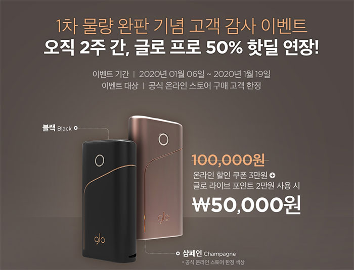 딱 2주간 ‘공식 온라인 스토어’에서 진행되는 글로 프로(glo pro) 핫딜은 이미 1월 6일부터 진행돼 이번 19일. 즉, 1월 19일까지 핫딜이 연장 진행됩니다.(공식 온라인 스토어 링크는 글 하단 참조)