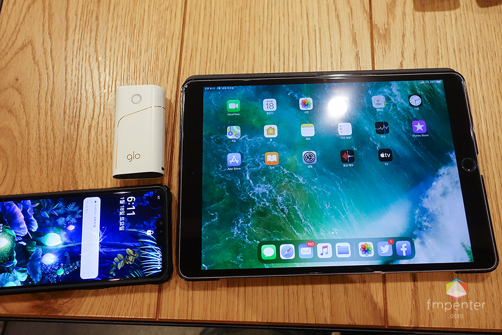 글로 프로(glo pro) 디바이스의 크기는 위 이미지에서 보듯 적정한 사이즈입니다. LG V50 씽큐와 애플 아이패드 프로 10.5를 놓고 사이즈를 비교해 봤는데. 보시다시피 적정한 사이즈입니다.