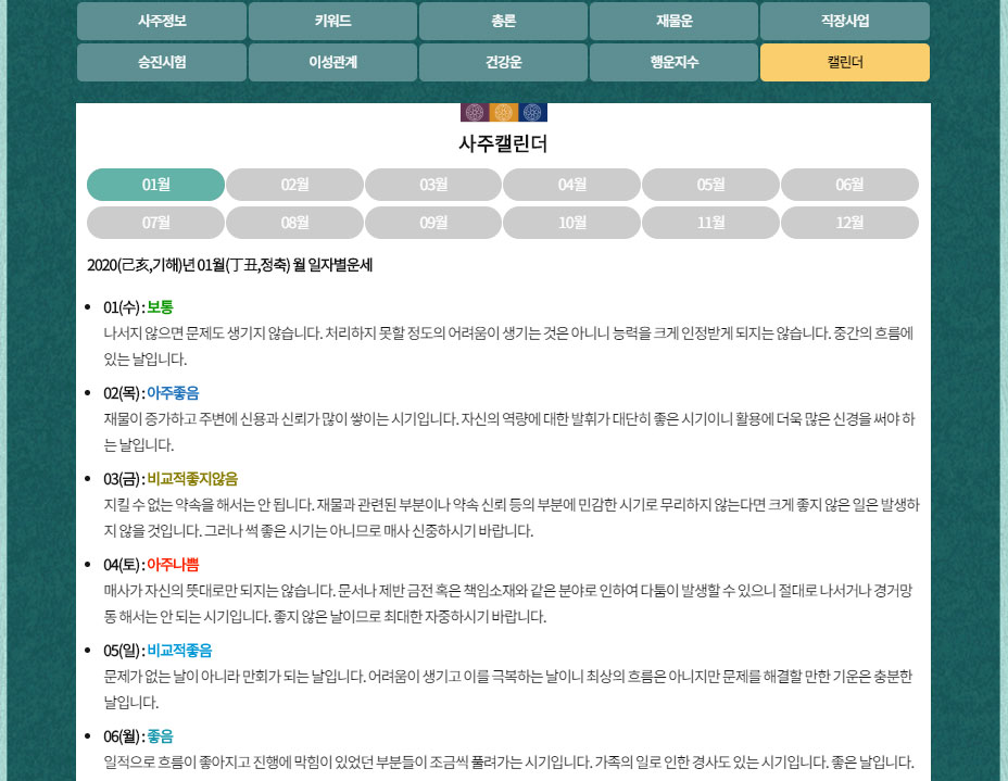 대분류에 해당하는 사주정보와 키워드 풀이, 총론 풀이, 재물운, 직장 및 사업운, 승진시험운, 이성관계운, 건강운, 행운지수운. 캘린더별 운수를 볼 수 있어 매우 도움이 되었습니다.