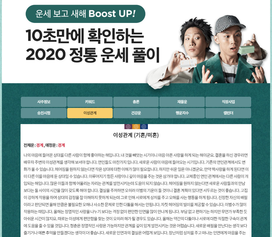 총 10개의 카테고리 서비스를 제공하는 쉽게 보기 힘든 충실한 서비스에 감탄이 절로 나옵니다. 누구라도 만 19세 이상이면 입장해 운세풀이를 보시길 권해 봅니다.