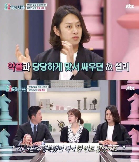 이어 설리가 <악플의 밤> 출연 당시 “많이 걱정했는데, 프로그램을 하고 정말 행복해했다. 전에는 자신감도 잃고, 이 세상에 있을 필요가 없다고 생각했는데 다른 사람들과 이야기를 하면서 풀어내니까 그 에너지가 좋았던 것”이라며 “나는 틀린 게 아니라 당당한 거라고 했다”며 설리의 말을 전하기도 했다.