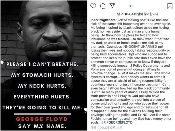 자신의 인스타그램에 “흑인 문화에 많은 영감을 받은 나로서는 그가 얼마나 무력감을 느끼고 비인간적인 대우를 받았는지 정말 안타까운 마음이다”라는 글을 올려 왜 행동하게 되었는 지를 설명했다.