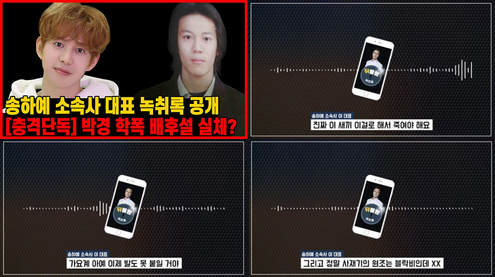 기자 출신 유튜버가 밝힌 자료 속 녹취 남성(송하예 소속사 대표)의 목소리에선 “박경은 내가 지금 잡은 게 있어서 죽일 거다. 원래 학폭 가지고 그거 당한 사람을 결국 찾았다. 내가 그걸 찾으려고 계속 조사했었다”라는 말을 했다. 복수 다짐과 구체적 행동을 했다는 자기증언인 셈. ‘찾았다’, ‘계속 조사했었다’라는 구체적 묘사가 그를 증명한다.