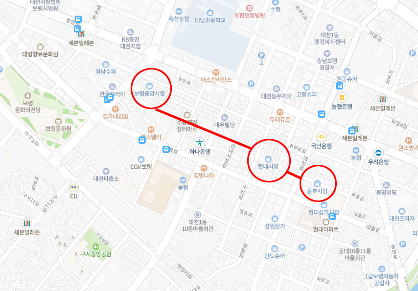 대천천을 매립해 선 동부시장인데요. 그만큼 중앙시장과 한내시장이 붐볐다는 증명을 동부시장이 생긴 것으로 증명하게 됩니다.