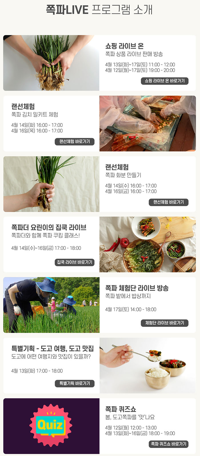 위 이벤트와 라이브방송 외에도 쪽파를 주제로 먹거리 및 미디어 체험 행사도 함께 열립니다. 물론 다양한 오프라인 체험 활동도 조심히 진행된다고 합니다.