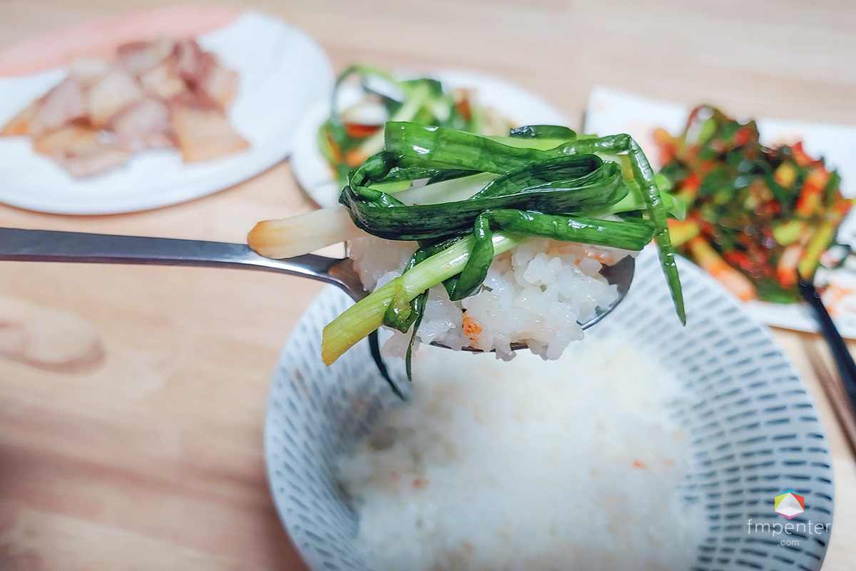 일단 쪽파김치만 쌀밥 위에 적당히 올려줍니다. 입이 작은지라 전 이게 적당히. 신선한 아산의 향이 올라올 정도로 봄내음이 가득 느껴지더군요. 새콤하고 달콤한 맛이 입맛을 돋우네요.