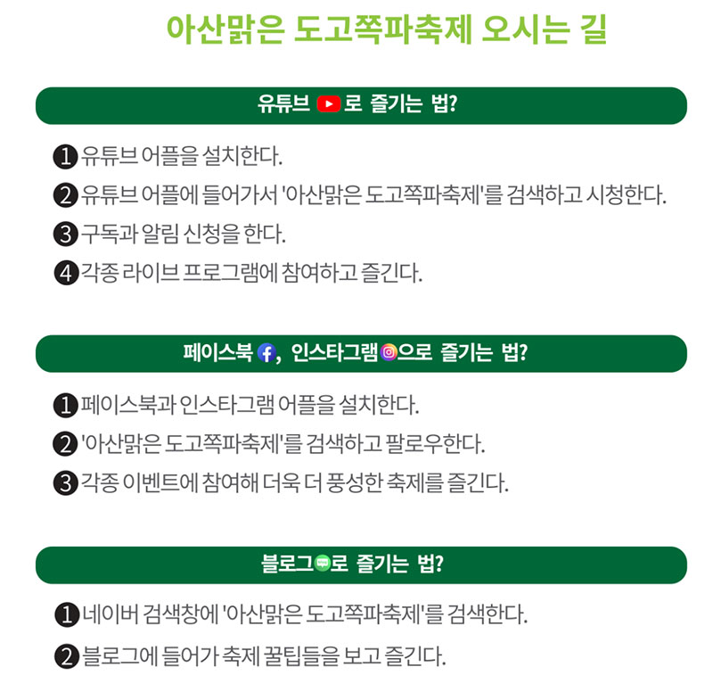 유튜브와 페이스북, 인스타그램 등에서도 접근은 쉽습니다. ‘아산맑은 도고쪽파축제’를 검색하고 팔로우해 참여하면 됩니다. 블로그 같은 경우 네이버 검색창에서 역시 ‘아산맑은 도고쪽파축제’를 검색하면 됩니다. 축제를 쉽게 즐길 수 있는 꿀팁들이 있다니 방문해 보는 것도 좋을 것 같네요.
