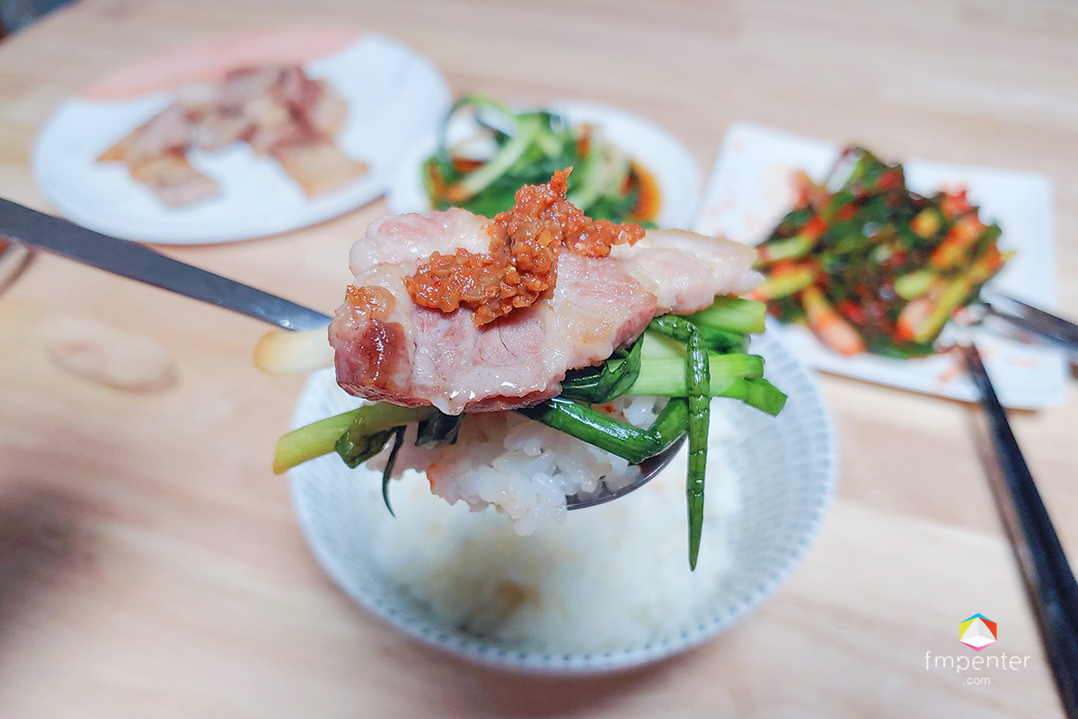밥 위에 쪽파장김치를 얹고. 그 위에 삼겹살을 펴주고. 쌈장을 척~ 올리면 한입 가득한 영양 덩어리들이 입으로 후딱 들어 가는 마술. 무한 반복은 기본. 밥 2그릇, 삼겹살 반근이 어느새 종적을 감출 정도로 혼자 파티를 했네요.