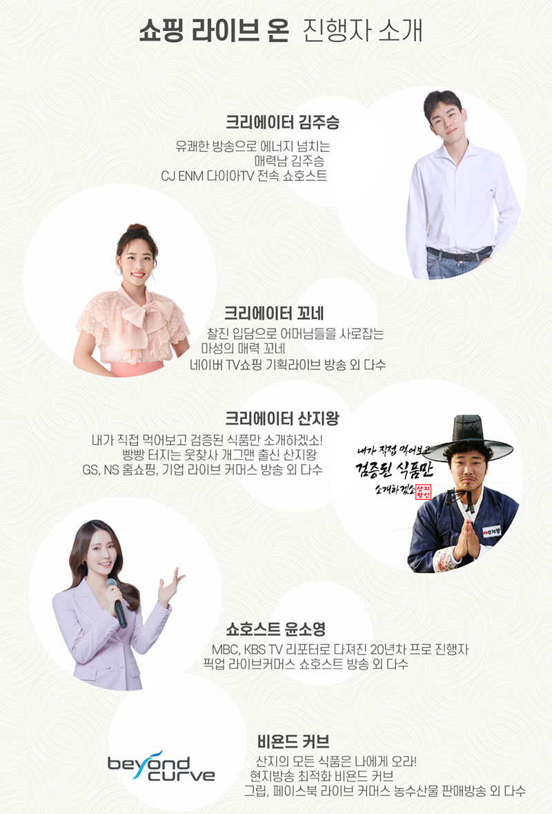 특히, 쇼핑 라이브 온 진행자로는 유명 크리에이터와 쇼호스트가 참여해 풍성한 재미를 준다고 하는데요. 크리에이터 김주승 씨, 크리에이터 꼬네 씨, 크리에이터 산지왕 씨, 쇼호스트 윤소영 씨, 비욘드 커브 채널이 함께 한다고 합니다. 독특한 재미를 누릴 수 있겠네요.