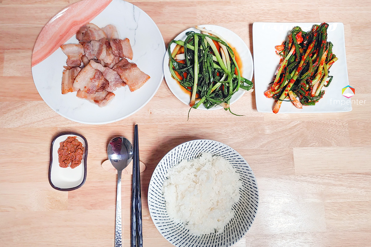 맛을 보기 위해 삼겹살만 살짝 곁들인 저녁을 먹기로 합니다. 하얀 쌀밥에 삼겹살. 주인공인 쪽파김치와 쪽파장김치를 한 상 폅니다.