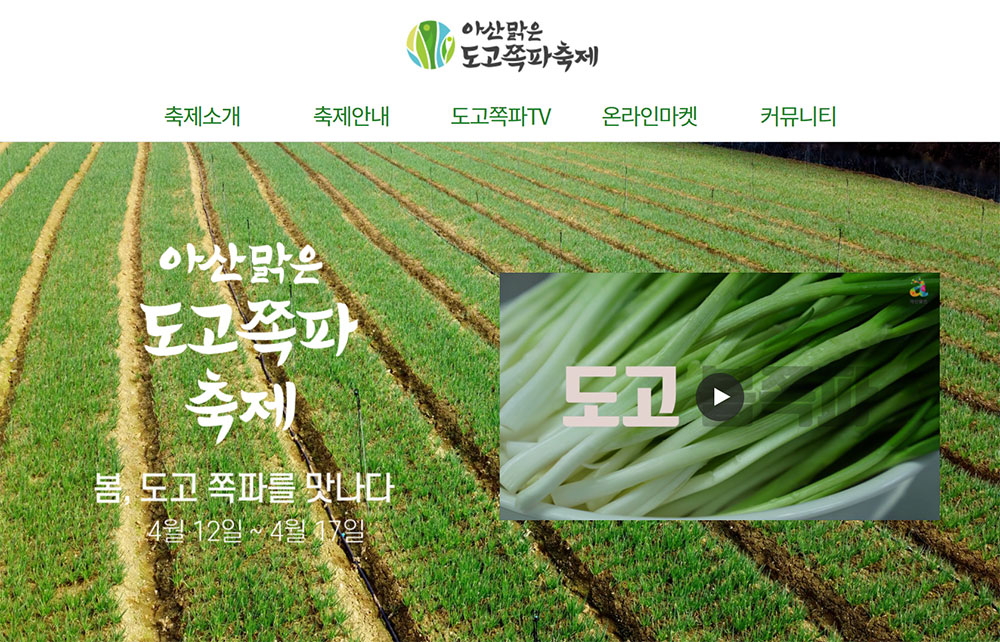 <아산맑은 도고쪽파축제>는 대한민국 쪽파 최고, 최대 산지인 도고 쪽파의 우수성을 알리고자 매년 4월에 열리는 축제인데요.