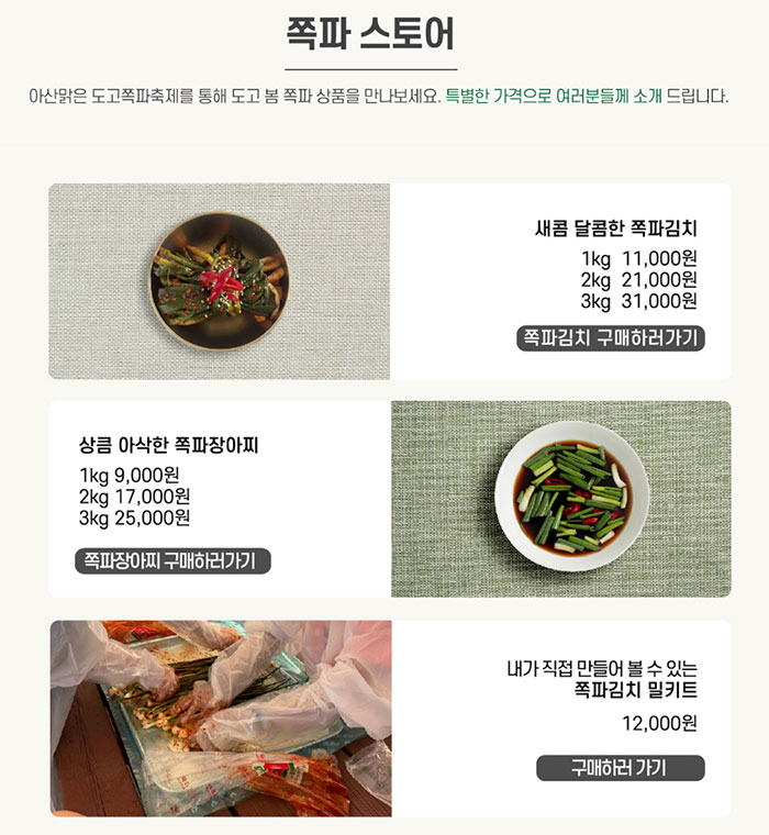 축제뿐만 아니라 현지 아산맑은 도고쪽파축제의 쪽파도 온라인 스토어에서 구매할 수 있는데요. 양념이 된 새콤달콤한 쪽파김치가 1kg, 2kg, 3kg 단위로 네이버 스토어에서 판매되고 있고요. 상큼 아삭한 쪽파장아찌도 1kg, 2kg, 3kg 단위로 네이버 스토어에서 구매할 수 있습니다.
