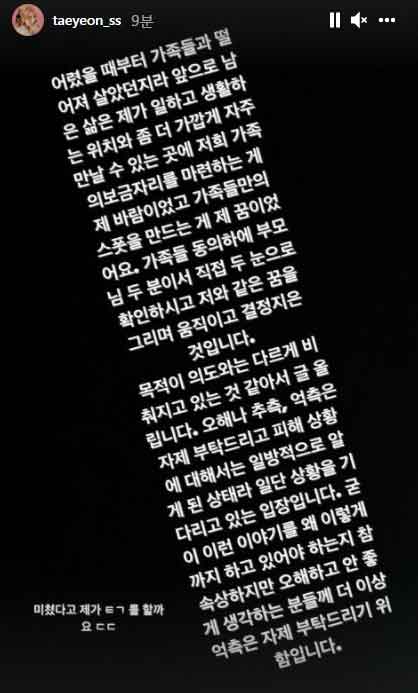 태연이 주장한 글의 내용에서 드러났듯 자신이 사는 곳과 멀지 않은 곳에 가족의 보금자리가 있었으면 하는 ‘바람은 있었다고 했고. 가족들 동의하에 부모님 두 분이 직접 두 눈으로 확인하시고 저와 같은 꿈을 그리며 움직이고 결정 지은 것’이라고 직접 말한 부분에서도 책임을 피하긴 어려운 팩트는 존재한다.